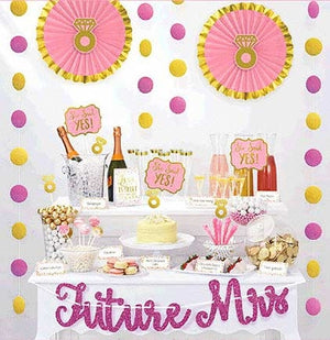 This 23pc Future Mrs. Decoration Kit is the perfect kit needed to glam up a dessert or gift table! It comes with Fans, Danglers, Tent Cards, a Banner and much more. Perfect to make the bride feel special.