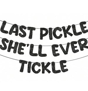 Celebrate the bride with the newest trend in bachelorette parties Last Pickle She'll Ever Tickle. This theme is a naughty riff on Last Fling Before the Ring. This set includes a black glitter Last Pickle She'll Ever Tickle banner and 3ft Inflatable Pickle. Have the party guests sign the 3ft Pickle for a keepsake for the bride after the party. Sure to have a DILL-lightful party!