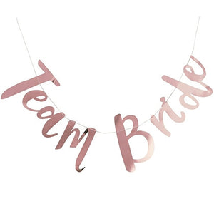 Decorate the bachelorette party with this fun metallic banner! It's a great inexpensive way to add additional fun and "pop" to your party! The 5ft banner says Team Bride in a pretty rose gold. Place it on a wall to decorate a room or dress up the party tables.