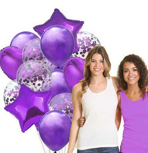 It's the bride's Last Fiesta! Celebrate with a South of the Border bachelorette party. This purple balloon bouquet will work perfectly with other festive colors like greens and yellows. The balloon set includes five purple round balloons, five purple confetti balloons, two heart shaped purple balloons and two star purple shaped balloons. These balloons are an inexpensive way to set the tone for the party.
