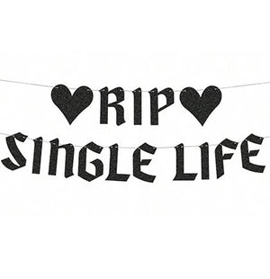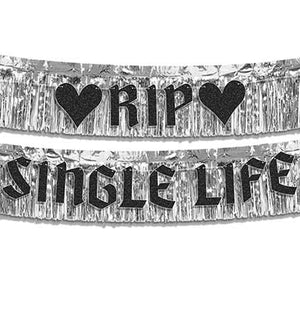 This black glitter RIP Single Life is perfect for a Til Death Do Us Party bachelorette. The banner says RIP Single Life accented with two heart icons in black glitter accompanied by silver fringe garland. Drape the set across a party or buffet table, hang it in a doorway or create a backdrop with other black and silver decor for a Bride or Die party.