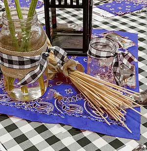 Add some country western flair to a Diamond & Denim Bachelorette Party with this blue bandana. It's the perfect accessory for a Bling & Blue Jeans themed party! This bandana can be tied around the neck paired with one of our rhinestone tank tops, some cutoff jeans and a pair of cowgirl boots. Or wear a tube top and tuck the bandana into it. It will also look cute as a placement with other western tableware.