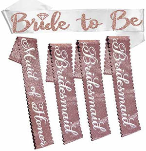This pretty bridal party sash set will be perfect for the Bridal Shower, Engagement Party or Bachelorette Party. The set includes a Bride to Be white satin sash, a Maid of Honor blush glitter sash, and three Bridesmaid blush glitter sashes. At this price point a must for a budget friendly party.