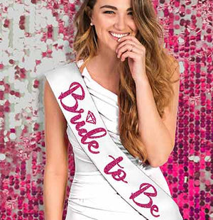 The bride and groom will love these gorgeous satin sashes! The set includes a Bride to Be white sash with magenta lettering and a Groom to Be black sash with silver lettering. The sashes are made with premium quality double-layer satin with a no shed sparkle graphic. The perfect set for them to wear to their wedding parties, engagement party or wedding reception.