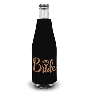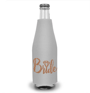 Looking for a unique party favor for the bride who loves rose gold? This bottle cooler is perfect in include in a bachelorette party gift! This bottle cooler says BRIDE in a pretty rose gold glitter and accented with a diamond icon. The perfect keepsake to remember the day!