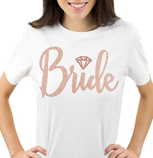 The Bride will love this tee! The tee has rose gold rhinestuds on the front that spell out BRIDE accented with a rose gold glitter diamond icon. With this bold tee she will definitely stand out in the crowd.