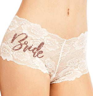 The bride will love this gorgeous lace panties! The boyshort style panties say Bride in a pretty rose gold glitter on the front right hip. They'll make a fantastic gift for a bridal shower, bachelorette party or lingerie shower! She can wear them during the honeymoon or any time after the wedding!
