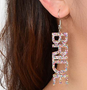 These Bride will look fabulous rocking these earrings at her bachelorette party. The lightweight multi-colored glitter earrings are made of plastic with a hook backs for a comfy and easy wear to party all night in. These fun earring will look great on the bride in all the party pictures.