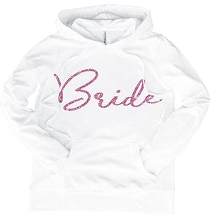 Looking for a special and unique gift for the bride? This trendy lightweight pullover hoodie is the perfect gift. The thin hoodie says Bride in a pretty pink script font with a font kangaroo pocket. The bride can wear to any pre-wedding event or the morning of her wedding while getting ready.