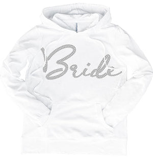 The bride will love this lightweight pullover hoodie! The thin hoodie says Bride in real crystal rhinestones on the front with a kangaroo pocket. She can wear to a spa day bachelorette party, running wedding errands or the morning of her wedding while getting ready.