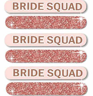 Add this set of emery file boards to a bride squad gift bag. This set is rose gold glitter on one side and has a "Bride Squad" graphic on the other side. Easy to pack for travel. These nail files will get lots of use leading up to the wedding day.