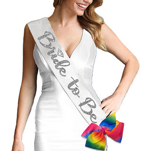Celebrate the bride with our fabulous satin sash and rainbow clip! The bridal sash says Bride to Be and is made on premium satin with a fabulous silver glitter graphic! Accent the sash with our fun rainbow clip, which can be attached anywhere on the sash. This sash is perfect for LGBTQ+ bachelorette parties, bridal showers and makes a great gift that the bride will treasure.