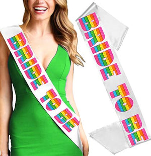 Brides are having Margs & Matrimony themed bachelorette parties, and our fiesta sash will be perfect for her to wear. Our exclusive white sash says Bride to Be in a colorful piñata print. Whether the party is a Last Siesta or a tequila themed bach party our sash will be the hit of the party.