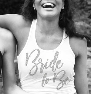 Have the bride stand out with this fabulous tank top. This ribbed tank says Bride to Be in bold glam font with real rhinestones. Get this for the bride to wear at her bridal shower, bachelorette party or any wedding event.