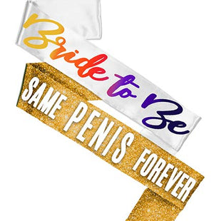 Siesta, Fiesta, Tequila! Throwing the bride a trendy Tequila Sunrise bachelorette party? Our white premium satin sash says Bride to Be in warm ombre color pattern. Our gold sparkle sash says Same Penis Forever in white lettering. The perfect sashes to wear on the bride's final fiesta!
