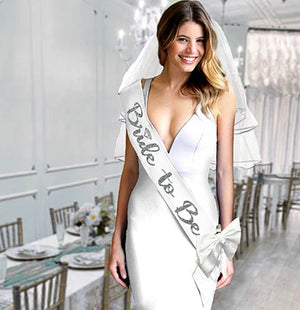 The Bride to Be will love all of the amazing things in this silver and white gift set! The set includes a white tulle veil, satin bow clip and a gorgeous Bride to Be white sash with silver glitter lettering. It has all of the accessories the bride will need for her bridal shower, engagement party, or bachelorette party!