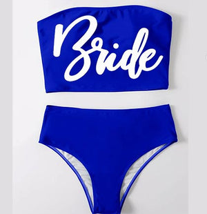 Celebrating the bride at a destination resort for a bachelorette party weekend? Blues are the hottest color to wear this year. This gorgeous bikini suit is perfect for the bride This two piece high waisted swimsuit says Bride on the front in a white graphic. This vibrant hue will have her standing out at the beach or pool.