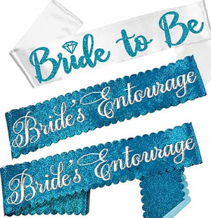 The bride and her entourage will love wearing these sashes at the bachelorette party or bridal shower! The bride sash says Bride to Be with turquoise lettering on a white sash. The entourage sashes say Bride's Entourage with white and gray lettering on a sparkle glitter turquoise sash. Plus, this Brides's Entourage sash matches our other turquoise sparkle sashes: Bride to Be, Maid of Honor & Bridesmaid available for purchase separately!