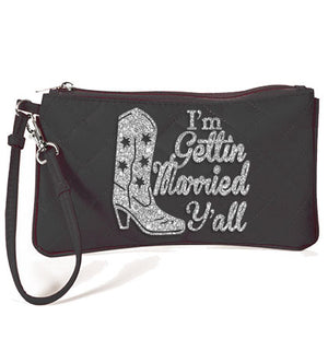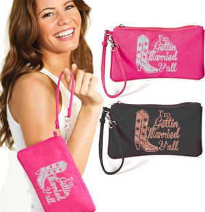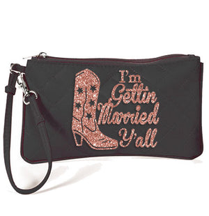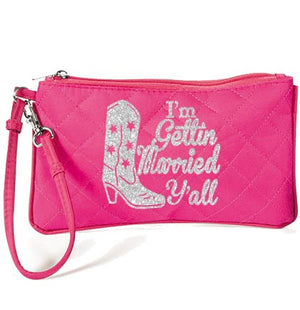 If you're looking for a cute bridal gift for a western bride, this quilted zip pouch is a great idea! Glitter on the front says I'm Gettin Married Y'all in either rose gold or silver! This zippered pouch would work well as a make-up bag, so fill it with fun items, or give it as a gift alone. A great keepsake!