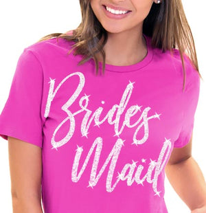 This t-shirt is a great alternative to a tank top! The bold t-shirt says BRIDESMAID in real rhinestones on a bold magenta jersey tee. Perfect for the girls to wear to the bachelorette party or bridal shower.