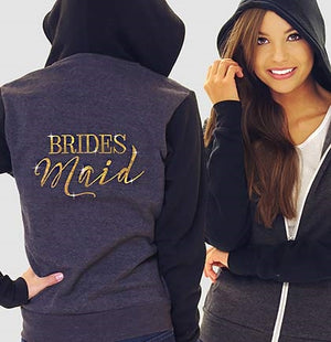 Celebrate your bridesmaid with this two tone fleece hoodie! The back graphic says "BRIDESMAID" in gold rhinestuds. Have her stand out at all the wedding events including the engagement party, bachelorette party, rehearsal dinners, getting ready the day of the wedding, and informal receptions.
