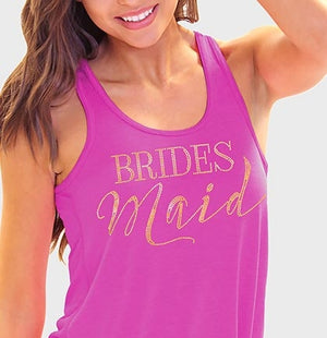 This adorable sheer magenta tank top says “Bridesmaid” in gold rhinestuds! The Bridesmaids will love wearing this cute flowy racerback tank to the Bridal Shower, Bachelorette Party or even the Bridal Party Spa Day. Our Bridesmaid tank tops have a modern flowy fit that looks cute paired with jeans or dressed up. The poly-viscose fabric will keep the Bridesmaids cool and comfortable no matter how wild the Bachelorette Party may get.