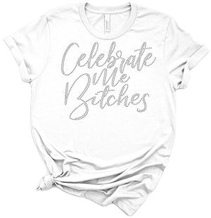 This funny white tee will have the bride standing out in the crowd and being celebrated at her bachelorette party. The tshirt is embellished with real crystal rhinestones that spell out Celebrate Me Bitches in real crystal rhinestones.