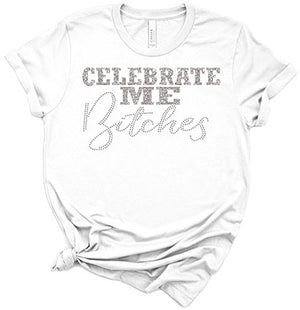 Celebrate Me Bitches Silver Sparkle & Rhinestone White Tshirt