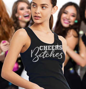 Cheers Bitches Silver Sparkle & Rhinestone Black Tank Top