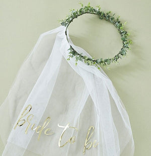 Have a bohemian bride who wants to stand out at her parties? This stunning plastic eucalyptus crown with white veil says 'Bride to Be' in a gold foil graphic. Great for a Bachelorette Party, Bridal Shower or any wedding event.