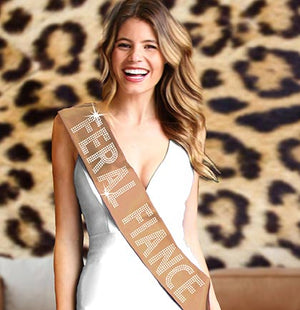 Is your bride a hot mess express that meets queen of the jungle? Our Feral Fiance Rhinestone sash will be perfect for the bride to wear to a Bride Gone Wild Bachelorette Party. Our sash is made with real crystal rhinestones on a premium quality double-layer satin made right here by one of our rhinestone artists in the USA!