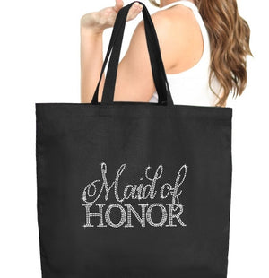 This tote is the perfect gift to give the maid of honor! Available in a variety of colors, the large size canvas tote says "Maid of Honor" in rhinestones. This tote will be a great keepsake after the wedding is over!