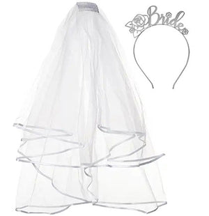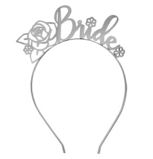 Every Bride needs to stand out in the crowd. This headband and veil set will make her feel special. Th metal headband spells out BRIDE in metallic silver and is accented with a beautiful, floral design. The white tulle veil is about 30" long with a teeth comb attachment. These are great accessories for bachelorette parties, engagement parties or bridal showers because they are more comfortable and easier to wear than traditional tiaras.
