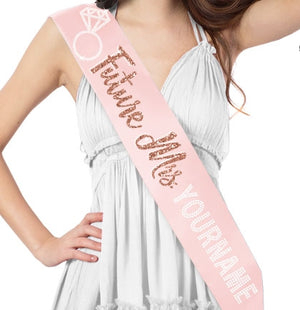 This top-quality personalized sash will be a Wedding keepsake the bride will always enjoy! This sash says Future Mrs. in premium rose gold glitter and multi-faceted crystal rhinestones plus, you can add the bride's new last name (up to 13 characters)! This stunning sash is the perfect gift to give the bride to be and is great for bridal showers, bachelorette parties, and rehearsal dinners. Our exclusive design, this sash is made for you by a rhinestone artist right here in the USA!