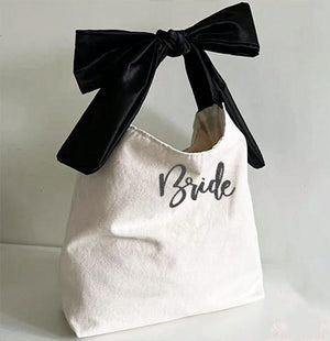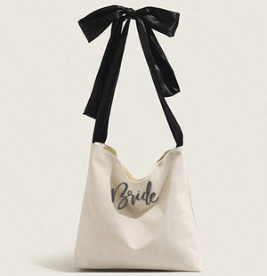 This handbag is big enough for the bride to carry party necessities! The handbag says BRIDE in black plus tie the black straps to her liking. While there are no pockets, nor does it close the handbag works perfectly for carrying essentials!