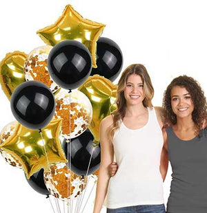 Does the bride want to have a more gothic themed bachelorette party? This gold and black balloon bouquet set will be an easy way to decorate a Til Death Do Us Party themed bachelorette. The balloon set includes five black round balloons, five gold confetti balloons, two heart shaped gold balloons and two star gold shaped balloons. This color palette also works with an animal print forward Bride Gone Wild bachelorette party.