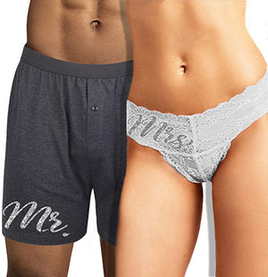 Searching for the perfect honeymoon gift for the bride and groom? This set is a great choice. It features a pair of charcoal solid boxers with Mr. in silver on the bottom right side, and a white lace thong with Mrs. in silver on the right hip. Stylish and fun, it’s an ideal present for the bride to enjoy with her groom at a lingerie shower or bachelorette party.