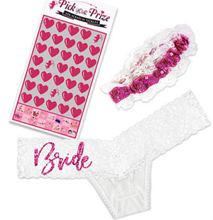This sexy set is perfect to get the bride for her bachelorette party or lingerie shower to take on her honeymoon. The set includes a thong, a garter and a sutra sex scratch ticket.  The white thong says Bride in hot pink glitter on the right hip. The high quality garter has hot pink sequins trimmed with white lace. The sutra sex scratch ticket reveals different sex positions to try out once scratched. The bride and her spouse will love this gift!