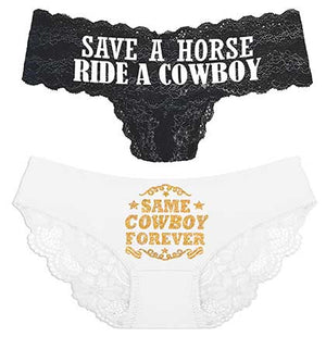 If the bride is celebrating with a Same Cowboy Forever bachelorette party, this panty set is a must have gift. The white bikini panties say Same Cowboy Forever in gold, while the black thong reads Save a Horse Ride a Cowboy in white. It's the perfect fun touch for the Bride's Last Ride party.
