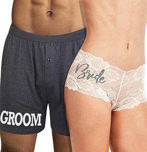 Wanting to get a gift for both the bride and groom? This undie set an excellent choice to get. The set includes a pair of boxers and a lace boyshort. The charcoal boxer-style underwear says Groom on the bottom right side in white. The white boyshort says Bride on the right in silver. This playful set makes a fun and memorable gift for the newlyweds!