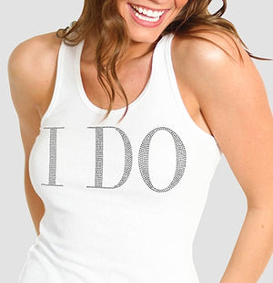 The bride will look wonderful when she wears this tank top! The cotton tank says 'I Do' in real rhinestones! Perfect for the bridal shower, bachelorette party, or while getting ready the morning of the wedding! The shirt makes a fantastic keepsake for the bride.