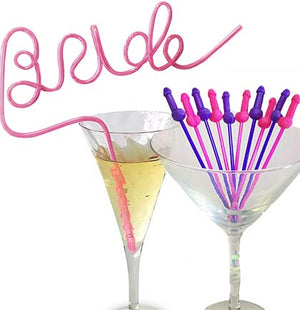 Bigger really is better plus every party needs penis straws! This jumbo pink Bride straw measures 10" wide and 11" long! The straw will make the bride feel extra special and everyone will know who she is. The set includes ten pecker shaped stirrers in a mix of pink and purple. A must have set for any themed bachelorette party.