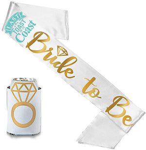 Last Toast on the Coast is the hottest bachelorette party trend. Celebrate the bride at a coastal destination like Santa Barbara or Charleston. Our bridal sash says Last Toast on the Coast in a pretty aqua and Bride to Be in gold. Accompanied by a white can cover with a gold ring imprint. This set will make a great keepsake that the bride will treasure long after the wedding is over.