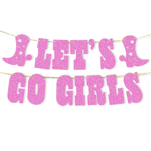 Let's Go Girls! This fun banner is a great way to decorate a Same Cowboy Forever bachelorette party! The western pink glitter banner is accented with two cowgirl boots in a sparkly pink. Place it on a wall to decorate a room or bring it with you to dress up a table at a restaurant or bar. Perfect for a bachelorette in Nashville or bring Nashville to the party.