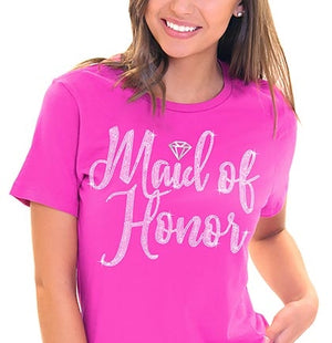 This t-shirt will be beautiful on the maid of honor! The tee has real rhinestones on the front that spell out MAID OF HONOR accented with a silver diamond icon. She can wear this bold tee at the bridal shower, bachelorette party, or for any other wedding-related function!
