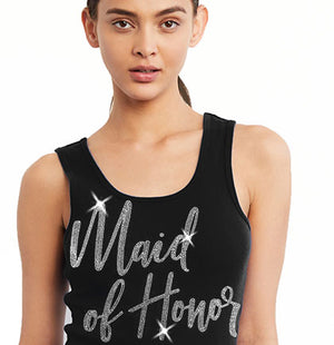Your best girl will love this tank top! The bold cotton tank says Maid of Honor in real rhinestones! Perfect for her to wear at the bridal shower, bachelorette party or any wedding related events!