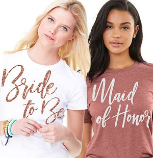 Get your BFF this gorgeous tee to wear to all the bridal parties. The jersey tee says Maid of Honor in a white glitter graphic on the front! Make sure to pair the tee with our bride and other Glam Bridal Party Shirts so all the girls will match at the party.
