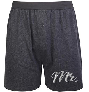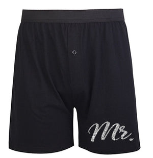 Don't forget the groom to be for a fun newlywed gift! This solid boxer style underwear says Mr. in silver glitter on the bottom left side with a black band on top. Make sure to pair it with a pair of panties for the bride to give the bride at her