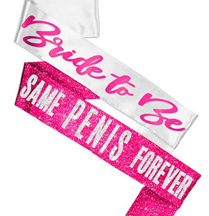 Have a bride who loves pink and wants to stand out in the crowd? Our hot pink sashes will be perfect for her to wear to her wedding parties. Our Same Pen*s Forever hot pink sparkle sash will have her turning heads at her bachelorette party. Our white Bride to Be with hot pink lettering sash will be ideal for a more family friendly bridal shower.