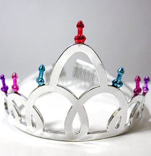 Show off your naughty self with this fun tiara! The silver tiara has accented multi-colored penckers. Get this for the bride and the girls to wear at the bachelorette party.